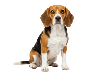 A cute beagle dog sitting and looking forward, isolated on a transparent background, showcasing its friendly expression and distinctive tricolor coat