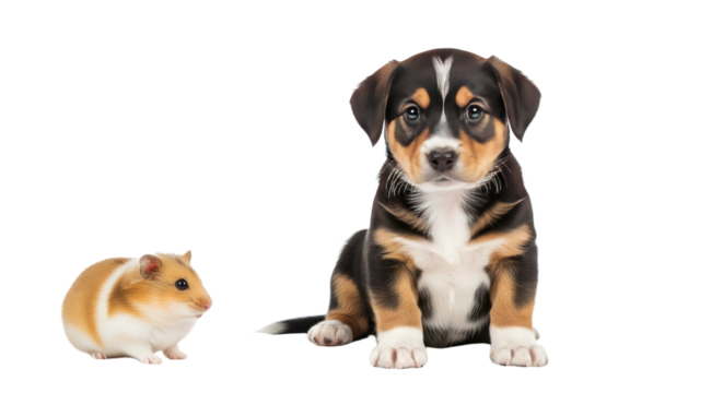 Cute tricolor puppy sitting next to a small brown and white hamster on white background, perfect for pet care or animal friendship themes