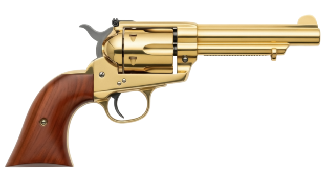Isolated vintage gold revolver, classic western firearm, with a wooden handle and silver hammer