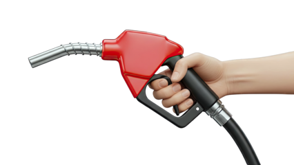 Hand holding white plastic spray bottle with red trigger for cleaning or cosmetic products. Isolated on transparent background, png