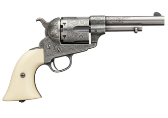 Engraved single-action revolver isolated on transparent background, antique firearm with ivory grip