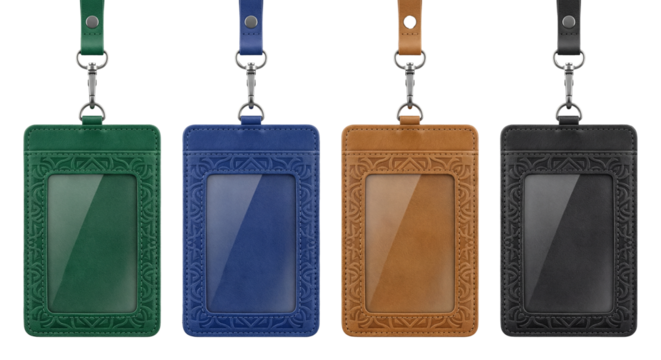 Four colorful leather id card holders with decorative trim and clear windows. Perfect for office, school, or event use, offering both style and functionality.