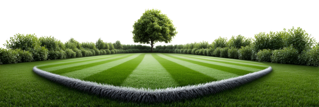 Lush green lawn with neatly trimmed grass and a solitary tree against a dark background. Png, Isolated on background.