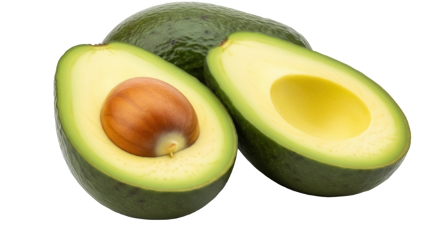 Isolated still life of a trio of hass avocados, two cut halves and one whole fruit, on a surface