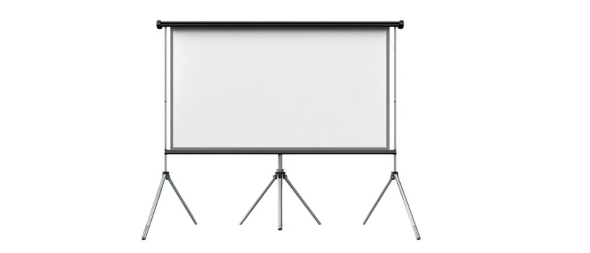 Blank white projector screen on a black tripod stand, ready for presentations, isolated on a transparent background. background removed