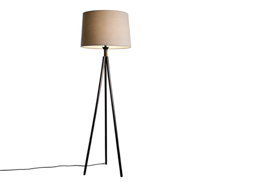 Modern tripod floor lamp isolated PNG on transparent background, contemporary lighting fixture with fabric shade for interior design