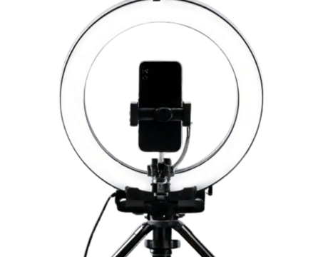 Mobile phone mounted on tripod stand, ready for content creation