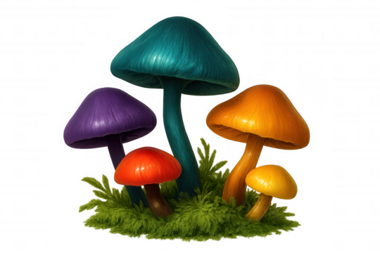 Colorful mushrooms sprouting from verdant grass, showcasing diverse hues against translucent backdrop