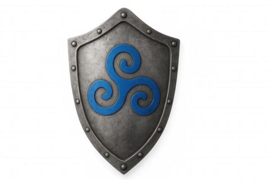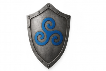 Medieval style metal shield presenting a blue triskelion symbol. Concept of protection, ancient culture, strength, and history. Transparent background