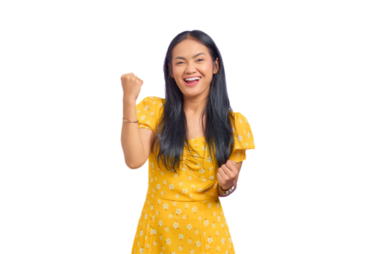 Portrait of excited young Asian woman celebrating success isolated on transparent background
