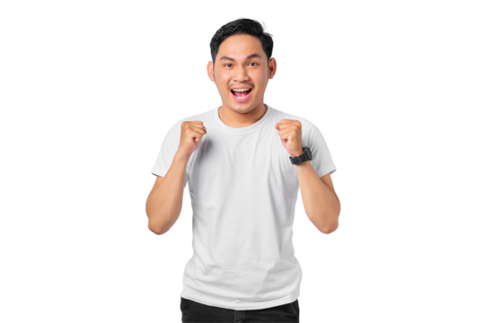 Emotional young Asian man celebrating big success isolated on transparent background