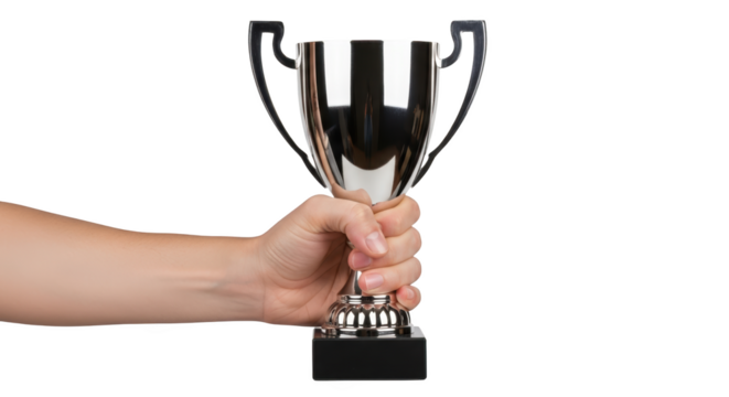 Triumphant hipster holding winner's trophy on transparent background