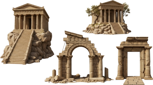 Ancient stone temple structures including temples on rocky outcrops a ruined triumphal arch and a broken doorway entrance suggesting classical antiquity ruins Architecture Archway Column