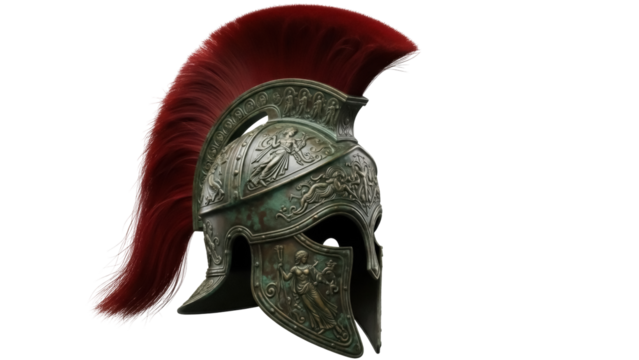 Ornate bronze Spartan helmet with red plume isolated PNG, ancient Greek warrior head protection on transparent background