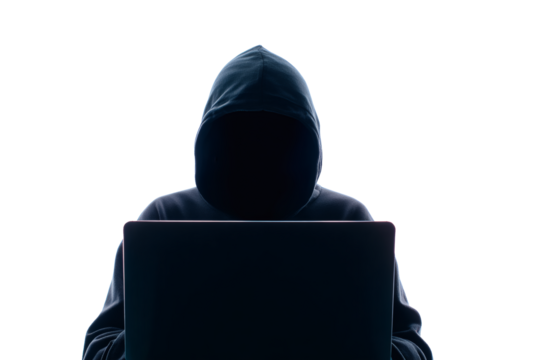 A mysterious figure in a hoodie works on a laptop in a dark room, evoking a sense of cybercrime and cybersecurity threats.