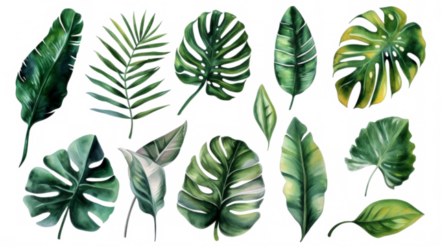 Set Collection Watercolor tropical leaves Modern green tropical leaves, clip art Botanical Illustration elegant watercolor illustration , green tropical leaves isolated transparent background, PNG