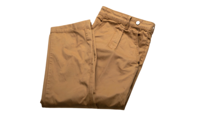 Men's light brown or khaki long chino pants with ghost model style isolated in transparent background