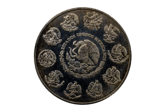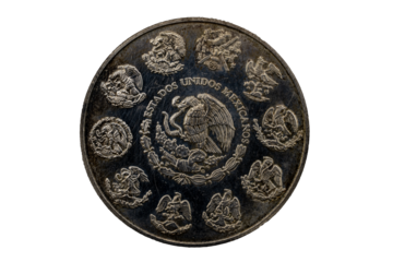 Anverso de la onza troy de plata mexicana de 2003 con imagen de las diferentes águilas devorando una serpiente.