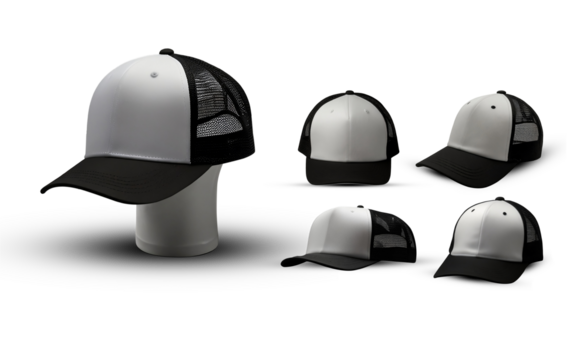 White and black baseball cap mockup set. PNG file of isolated cutout object with a transparent background.