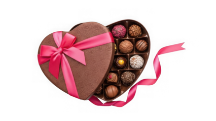 Open heart shaped chocolate box with pink ribbon and assorted truffles isolated on transparent background