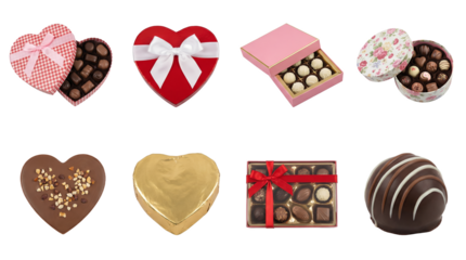 Chocolate gift box set including heart shaped, rectangular, and circular containers with truffles and pralines. Gourmet candy collection for Valentine Day and holidays.