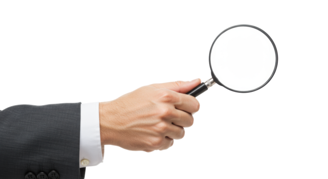Hand holding a magnifying glass, with the lens pointed towards the viewer