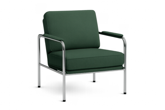 A highly detailed, mid-century modern armchair featuring a vibrant orange glossy plastic seat and polished chrome tubular legs, isolated on a stark white studio background, conveying conceptual