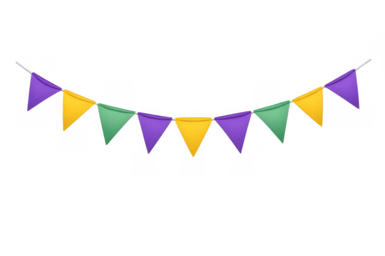 Mardi gras bunting with colorful purple, gold, and green flags, creating a festive carnival decoration on transparent background