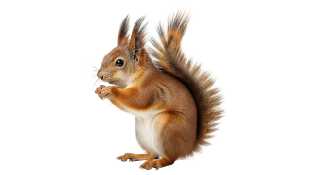 Isolated squirrel sits and eats, red fur, bushy tail and tufted ears, upright and alert