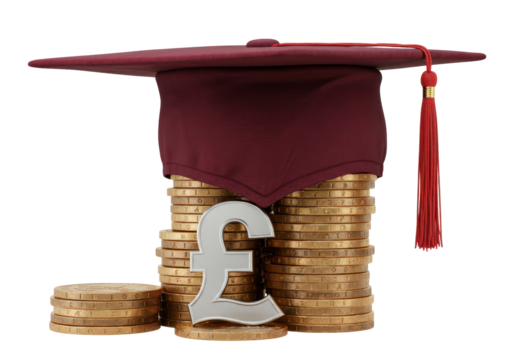 Isolated mortarboard atop coins with pound sterling, tuition or student debt financing