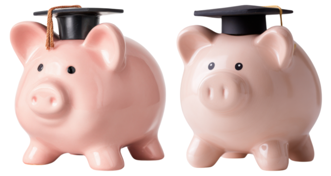Two piggy banks wearing graduation caps symbolize savings and education.