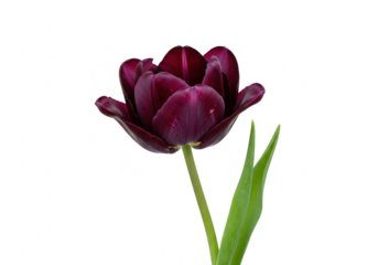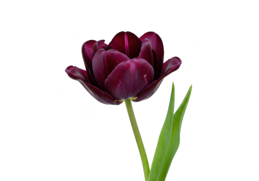 A single dark purple tulip flower in full bloom with green leaves, isolated on a transparent background