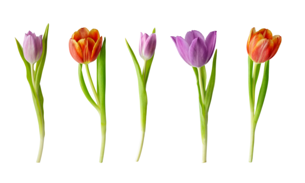Collection of tulip flowers isolated on transparent background. Set of variety springtime tulip flower for holiday decoration design.