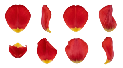 Red tulip petal set including curved, flat, and side view variants isolated. Floral design elements for spring and wedding themes.