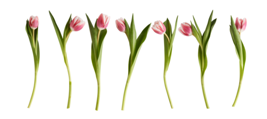 A collection of tulips in various shades of pink and yellow, solated on transparent background, PNG file with their stems intertwined