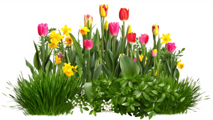 Pink yellow red tulips daffodils green grass isolated on a transparent background