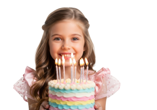 A joyful 7-year-old caucasian girl with blonde hair in a pink tulle dress holds a lit pastel birthday cake, smiling brightly against a transparent studio background. Birthday celebration atmosphere