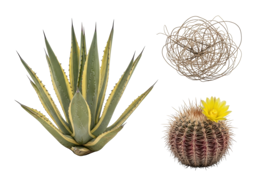 Isolated pale yellow agave, light brown tumbleweeds, deep red barrel cactus on transparent background with copy space. Commercial still life of arid desert resilience