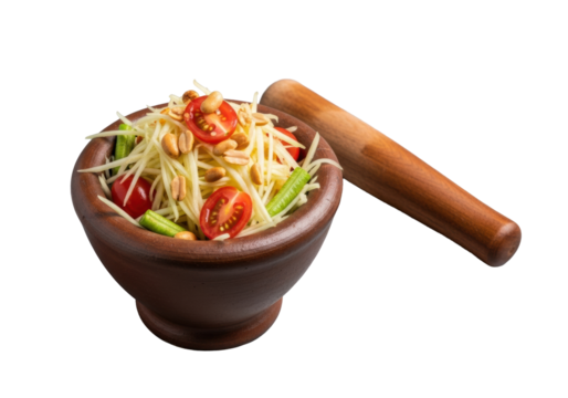 Vibrant green papaya salad (Som Tum) with tomatoes, peanuts, lime dressing in clay mortar, wooden pestle, transparent background, appetizing Thai food concept