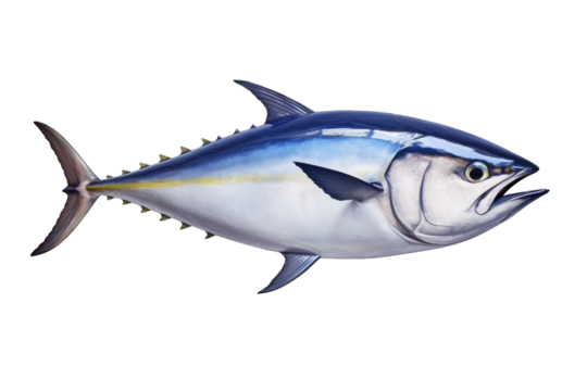 Isolated Yellowfin Tuna showing vibrant colors and streamlined body, a marine fish specimen