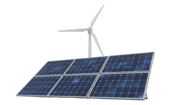 Solar panels and wind turbines generating clean and renewable energy as a sustainable alternative to fossil fuels isolated on transparent background