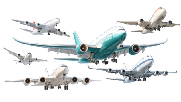 transparent modern commercial jetliner, powerful turbofan engines, extended landing gear, low-angle, suspended on transparent studio background, shadowless, modern aviation technology