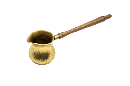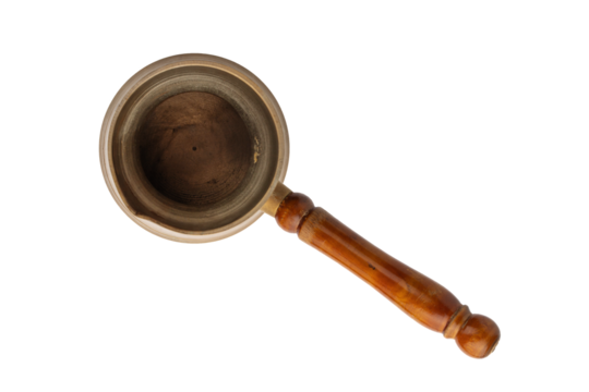 turka, a copper coffee pot with a wooden handle, isolated on a white background