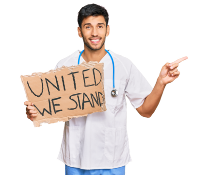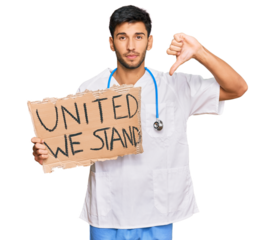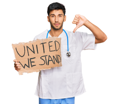 Young handsome man wearing doctor uniform holding united we stand banner with angry face, negative sign showing dislike with thumbs down, rejection concept