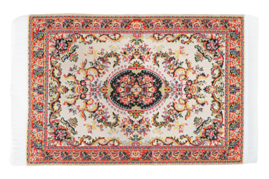 Traditional Persian-style red carpet with intricate floral patterns, isolated on white background