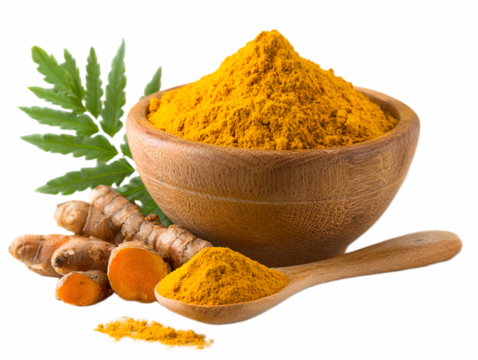 Turmeric Powder in Wooden Bowl with Fresh Turmeric Roots and Leaf on Transparent Background