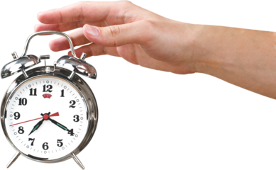 Purple classic alarm clock showing 3 o'clock on transparent background