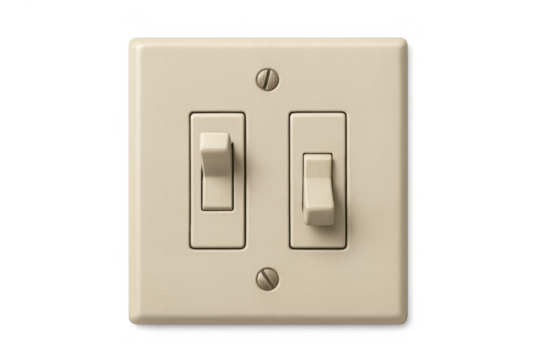 Double toggle light switch controlling power and electricity, turning lights on and off, with transparent background