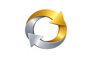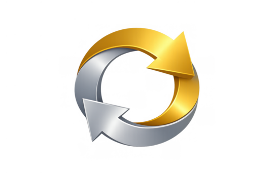 Golden and silver arrows forming a circular refresh symbol, representing cycle, update, and progress with metallic sheen