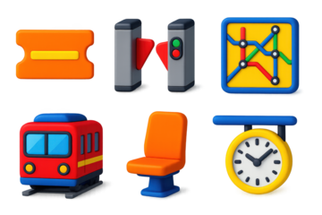 Modern Subway Icons. 3D icon set of subway travel: ticket, turnstile gate, subway map, train carriage, passenger seat, arrival